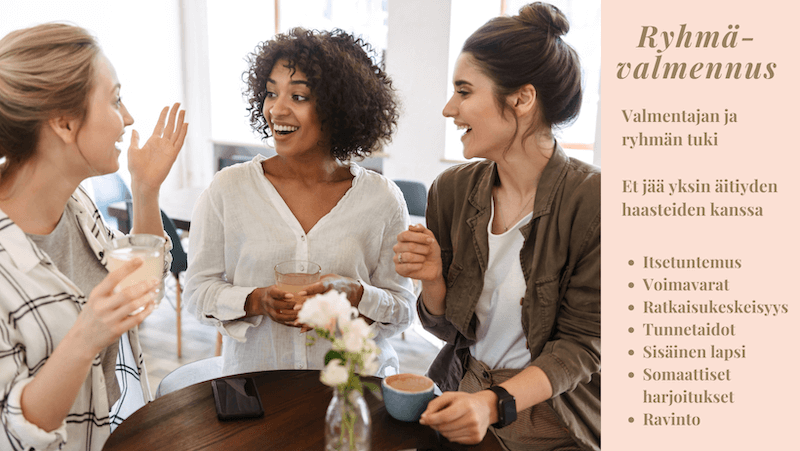 Ryhmävalmennus on pienryhmävalmennus (6-8 hlö) ja toteutetaan etäyhteydellä Zoomin välityksellä. Voit siis osallistua valmennukseen mistä päin Suomea tai maailmaa tahansa. Ryhmän tapaamiset ovat iltaisin kerran viikossa (Ryhmän toiveesta voidaan järjestää myös viikonloppuna tapaava äitiryhmä aikataulujen sujuvoittamiseksi).